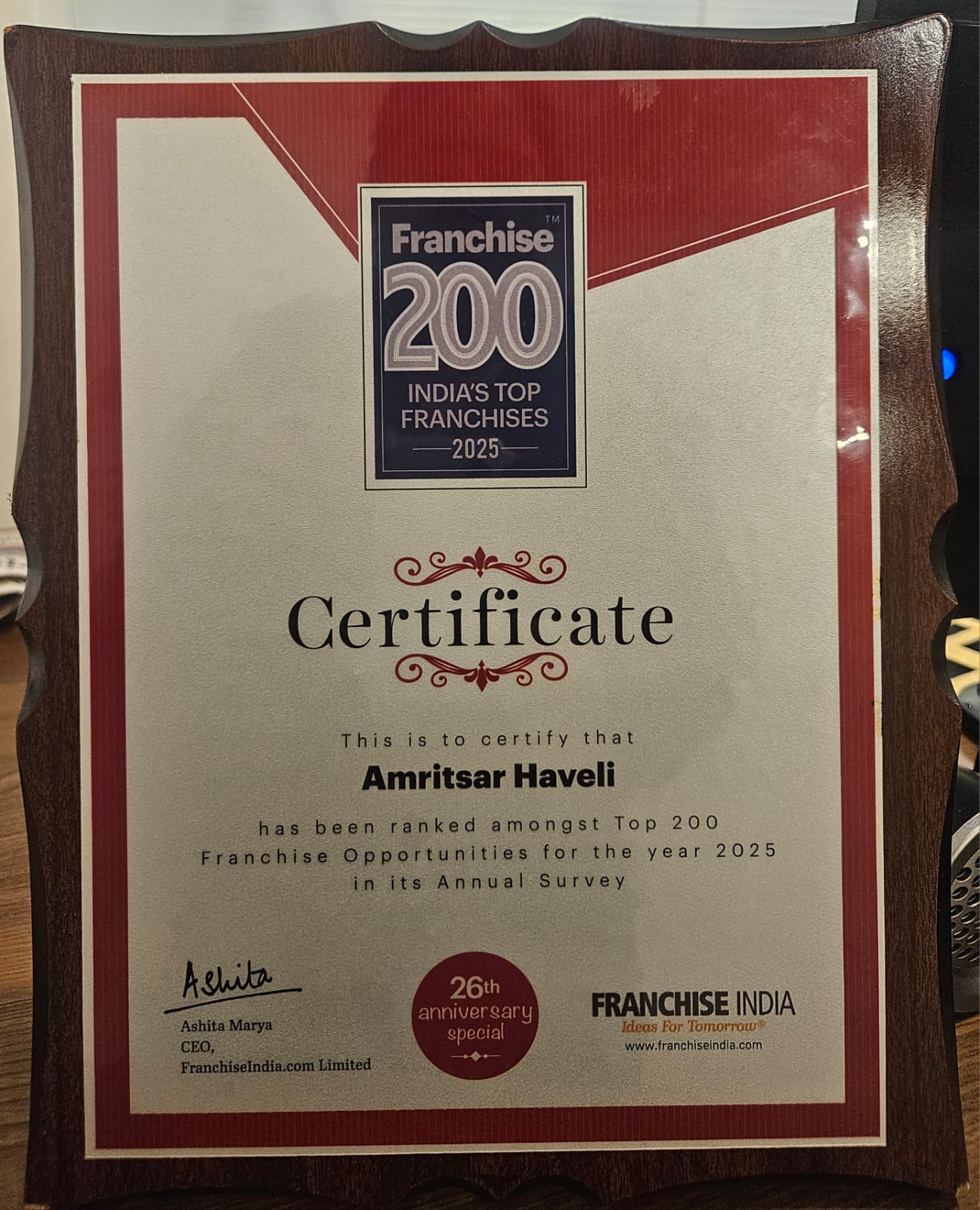 Amritsar Haveli ranked among India’s top 200 franchise opportunities in 2025 by Franchise India organization.